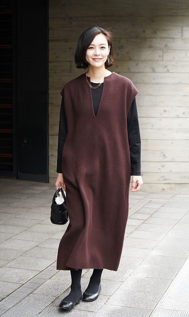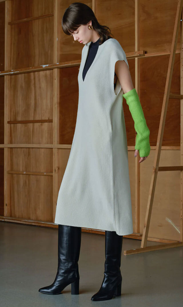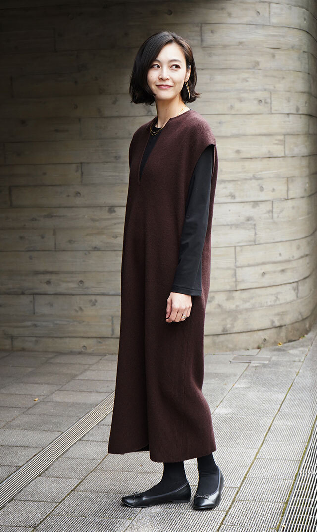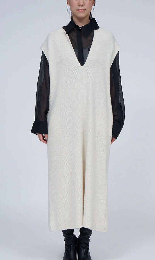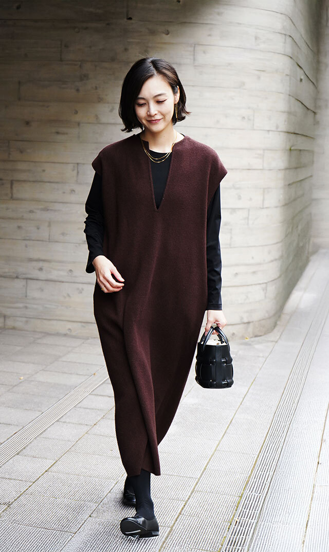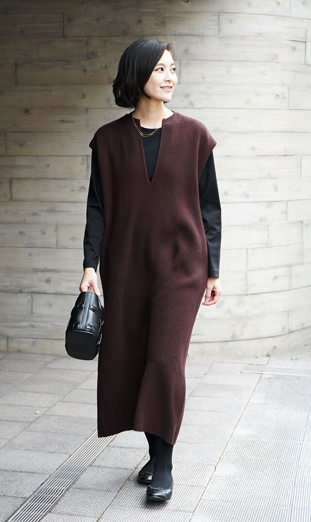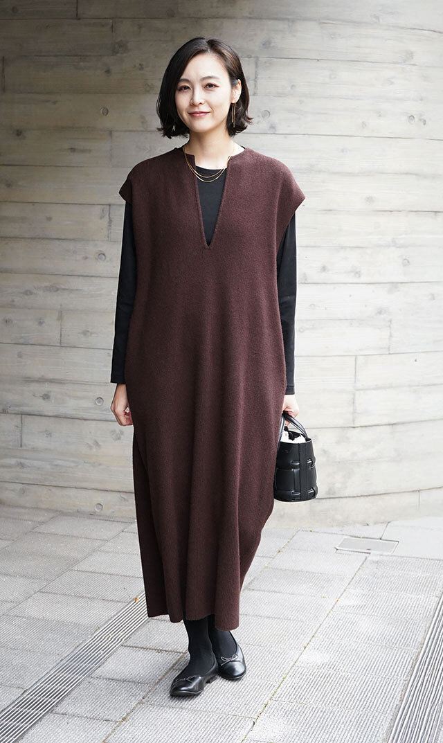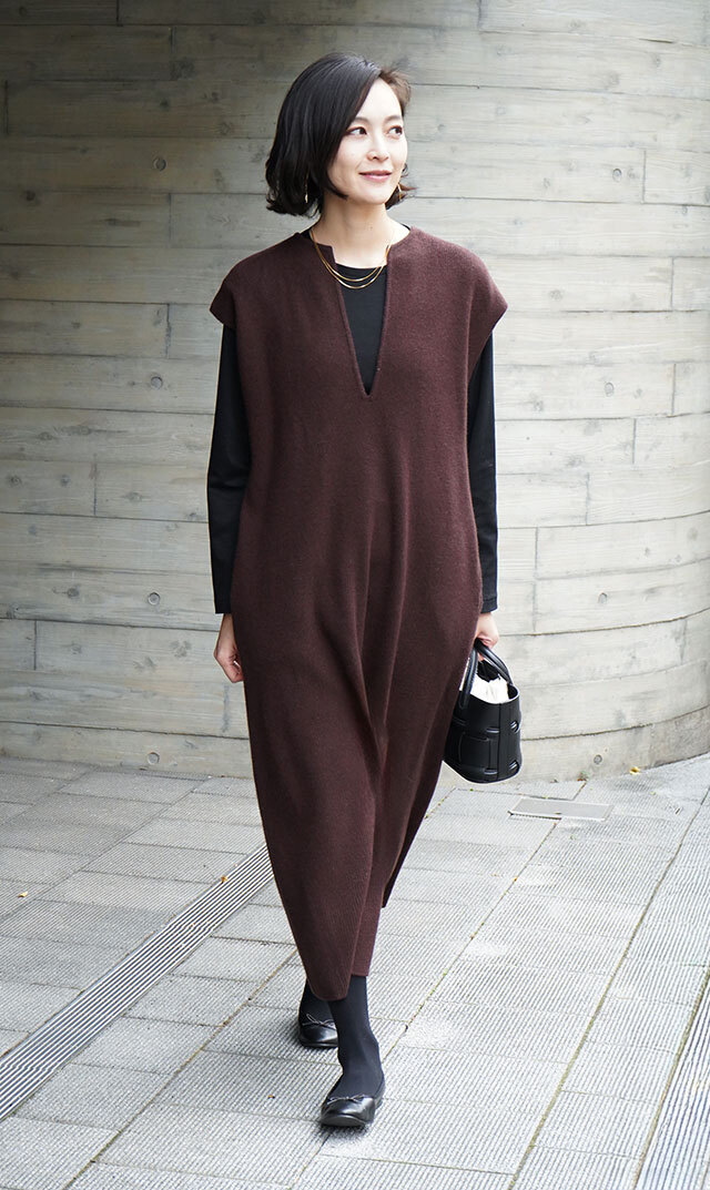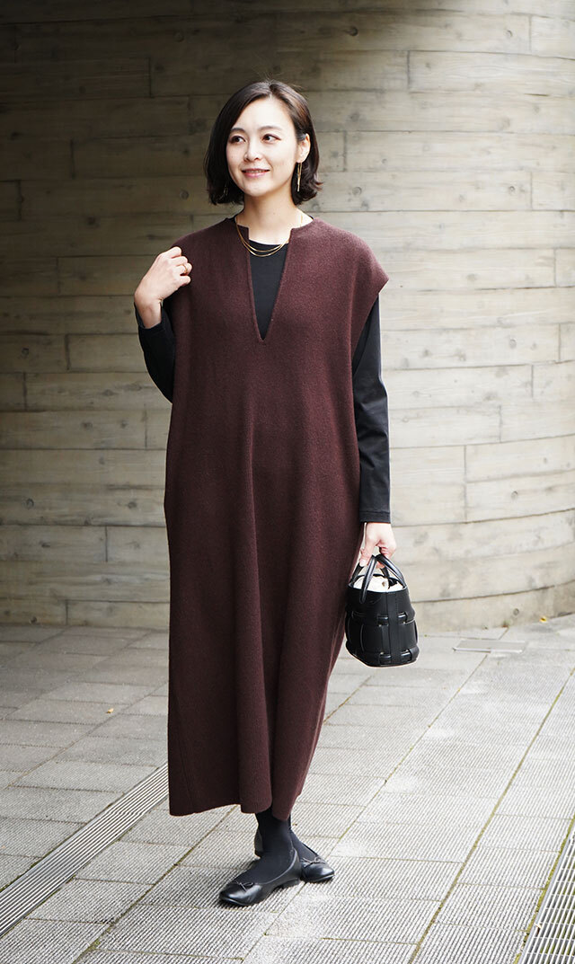 高品質なニュージーランドメリノウールを使用し、多くの方が着用できる絶妙な丈感の “KAFTANニットワンピース”