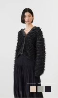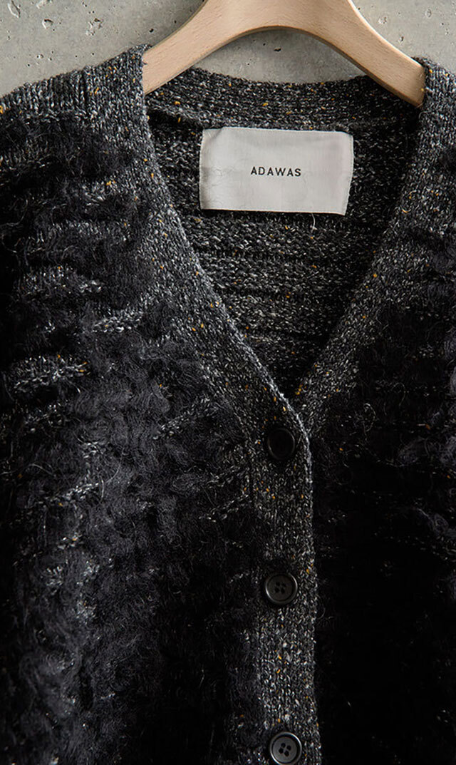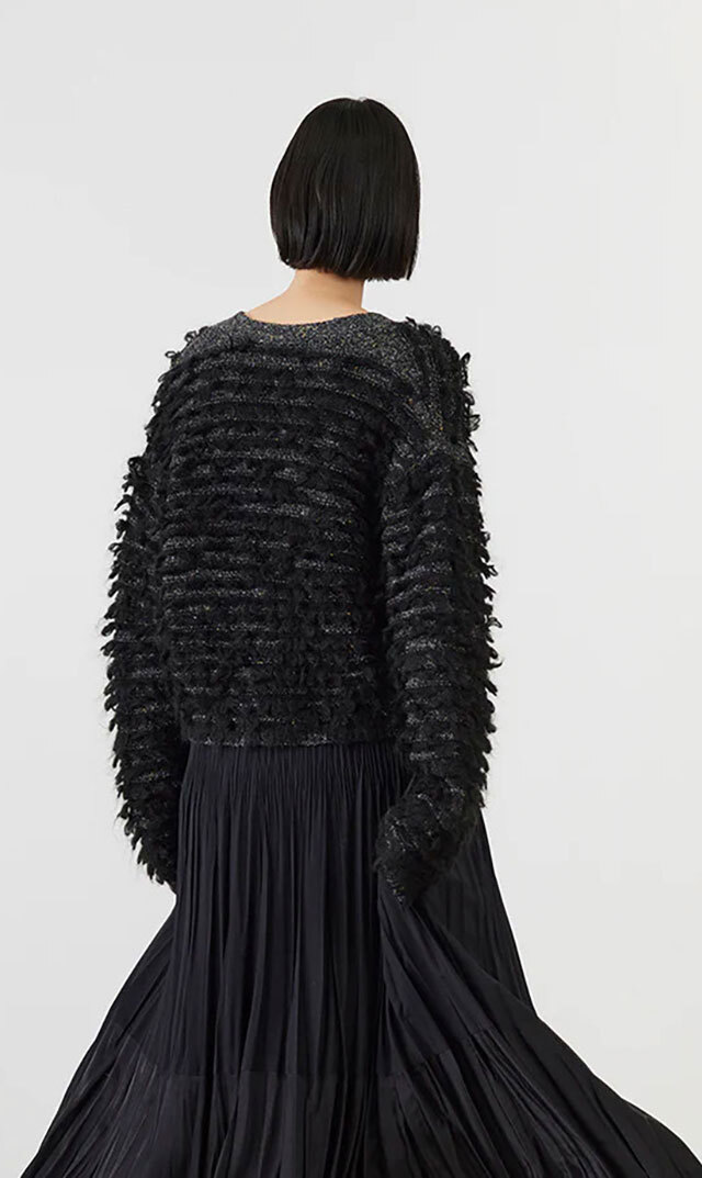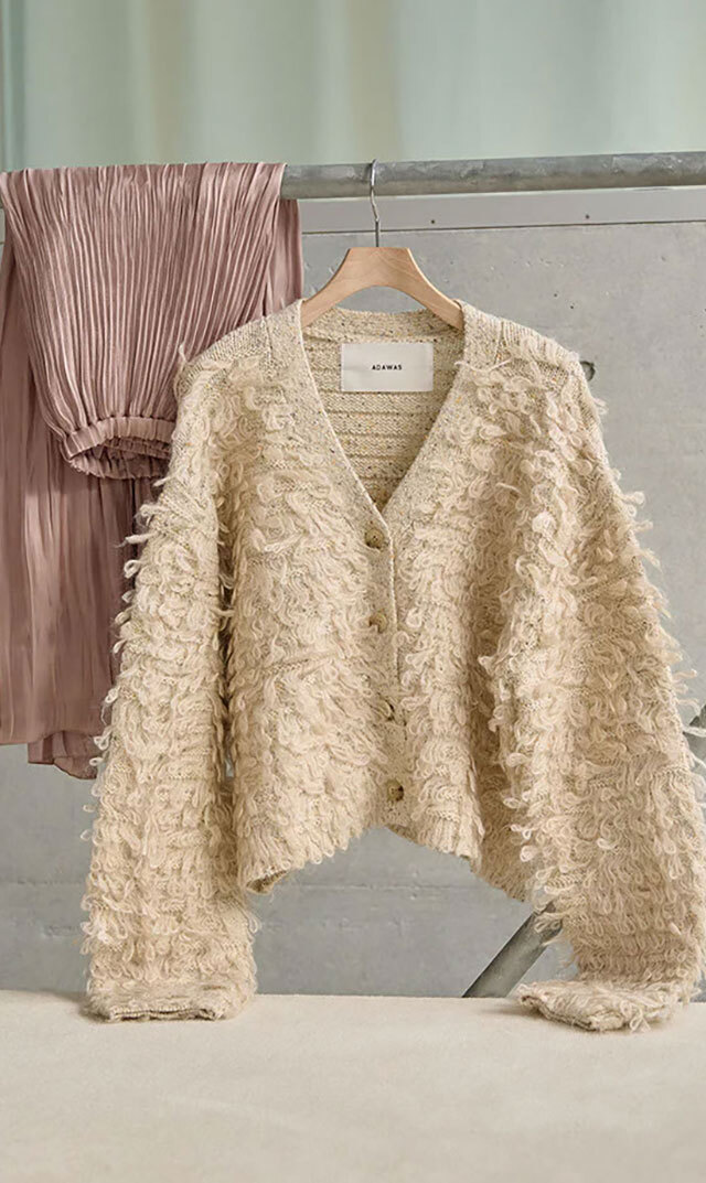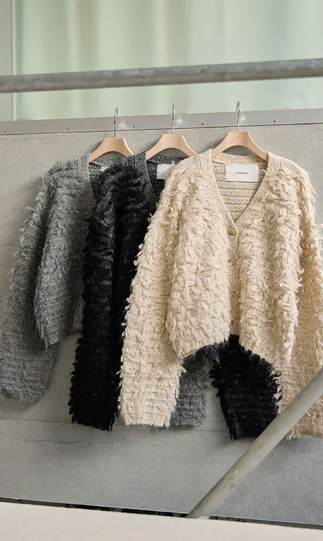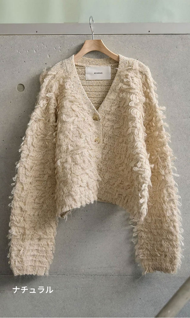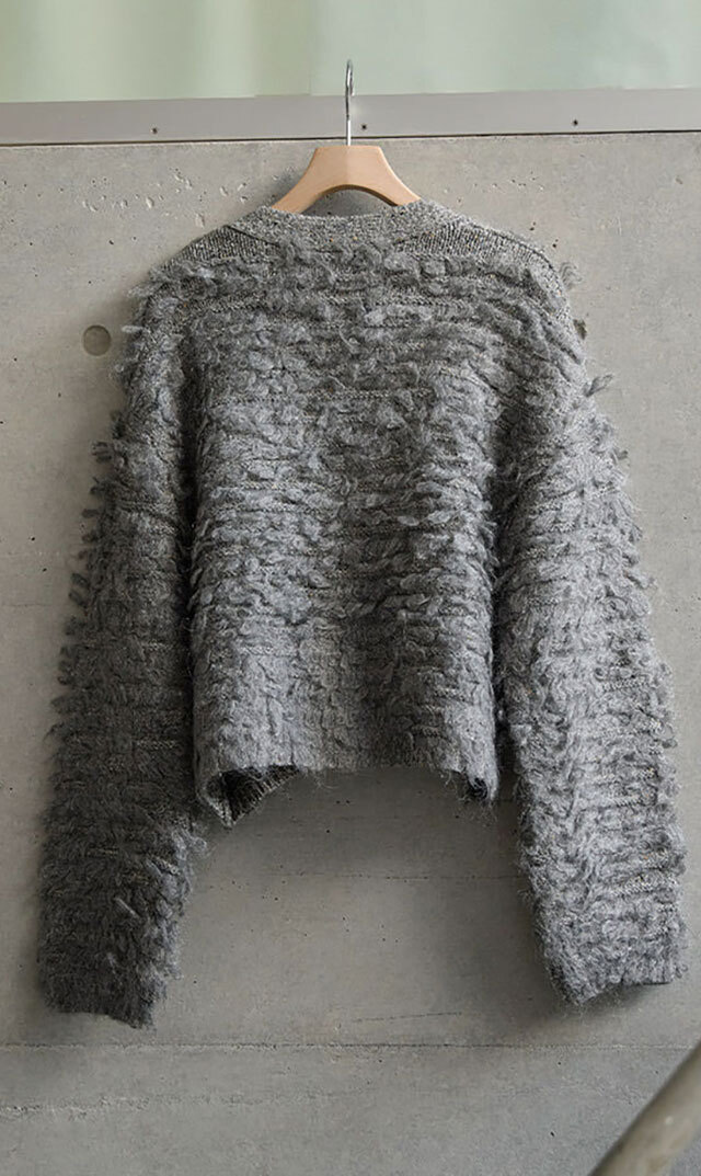 ツイードヤーンとキッドモヘヤのループ編みを組み合わせた、表情豊かなカーディガン “ループフリンジニットカーディガン”