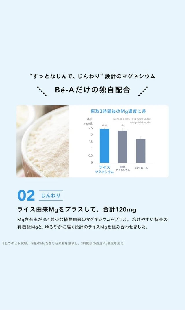 現代女性のマグネシウム推奨摂取量と平均摂取量から導き出した、不足をサポートできるよう考えられた、続けやすい120mgを配合。