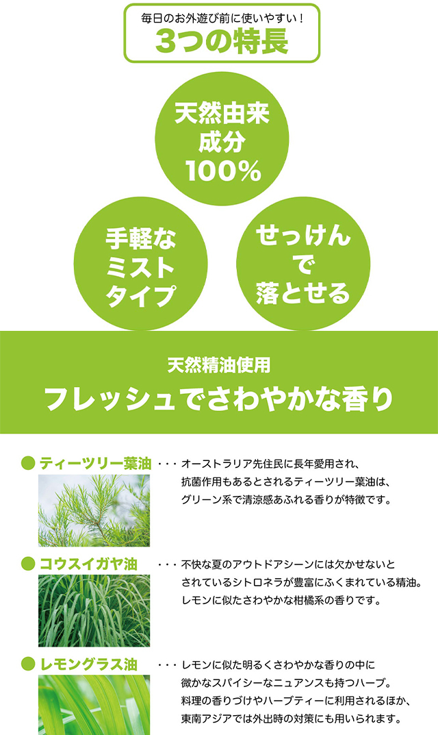 お出かけに便利なミストタイプで、簡単に石けんで落とせます。