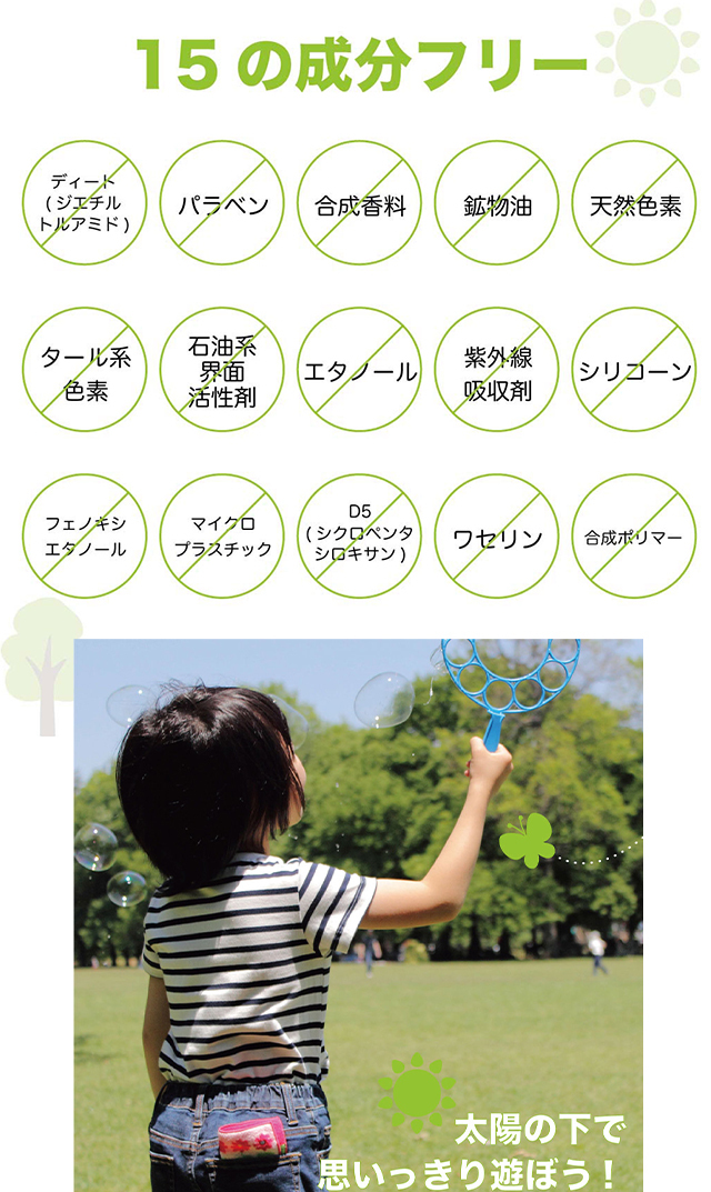 肌に優しい天然由来成分100%でノンケミカル処方*の日焼け止めです。ディートやシリコンなど15フリー処方。