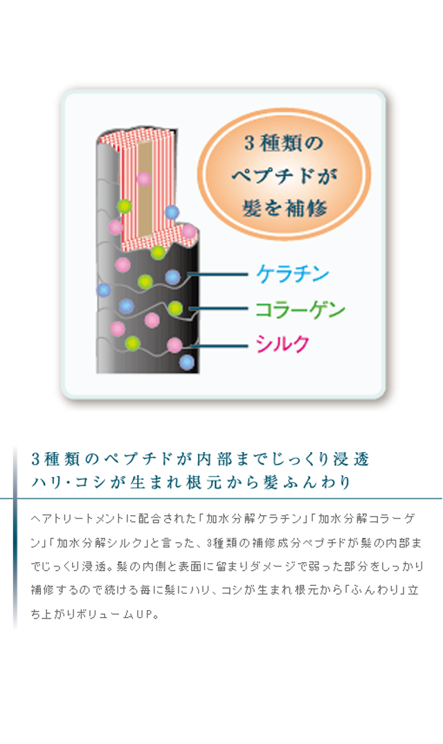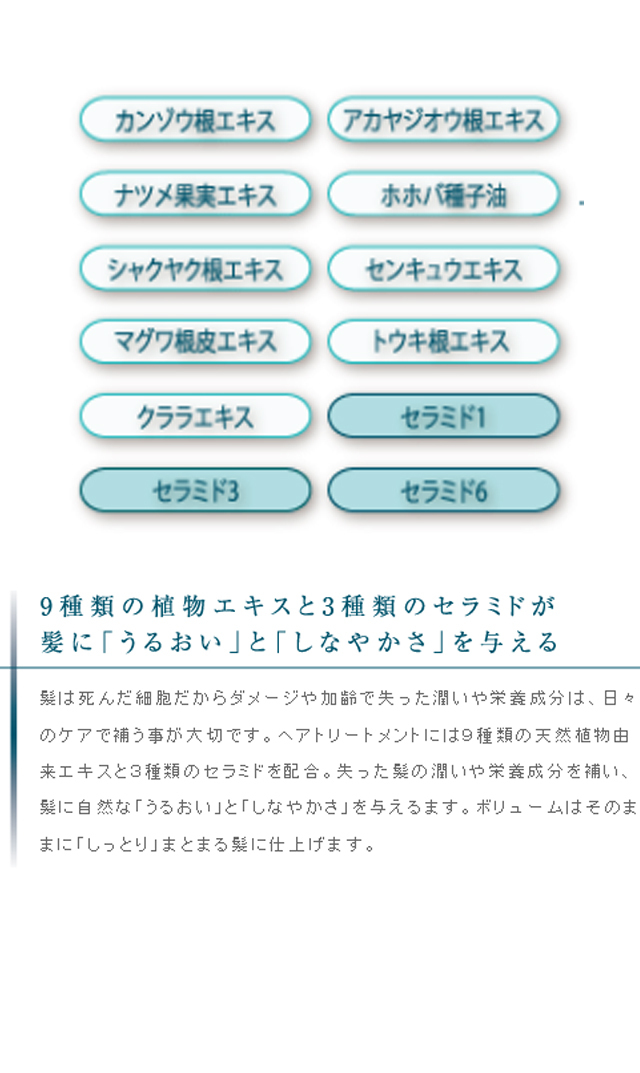 全成分:水、セタノール、ステアルトリモニウムプロミド、シクロペンタシロキサン、セテアリルアルコール、アモジメチコン、ジメチコン、ステアルトリモニウムクロリド、イソプロパノール、ベヘントリモニウムメトサルフェート、イソアルキル(C10-40)、アミドプロピルエチルジモニウムメトサルフェート、ラウロイルグルタミン酸(フェトステリル/オクチドデシル)、ローズヒップ油、フェノキシエタノール、BG、加水分解コラーゲン、加水分解ケラチン(羊毛)、加水分解シルク(加水分解シルク/PG-プロピルメチルシランジオール)クロスポリマー、クオタニウム-33、ポリクオタニウム-51、ナツメ果実エキス、トウキ根エキス、シャクヤク根エキス、カンゾウ根エキス、センキュウエキス、マグワ根皮エキス、オタネニンジン根エキス、クララエキス、アカヤジオウ根エキス、ベニバナ赤、ベビバナ黄、エタノール、銅クロロフィリンNa、セラミド1、セラミド3、セラミド6?、フィトスフィンゴシン、コレステロール、ラウロイル乳酸Na、カルボマー、キサンタンガム、クエン酸、香料