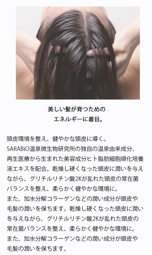乾燥し硬くなった頭皮に潤いを与えながら、グリチルリチン酸2Kが乱れた頭皮の常在菌バランスを整え、柔らかく健やかな環境に。