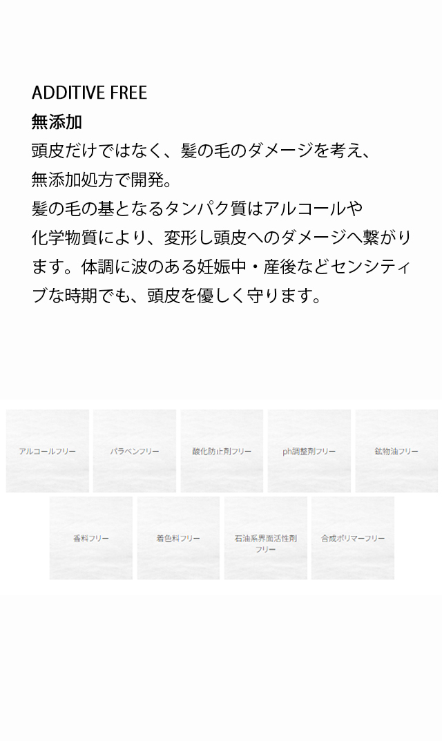 また、頭皮だけではなく、髪の毛のダメージを考え、無添加処方なので、 髪の毛の基となるタンパク質はアルコールや化学物質により、変形し頭皮へのダメージへ繋がります。体調に波のある妊娠中・産後などセンシティブな時期でも、頭皮を優しく守ります。