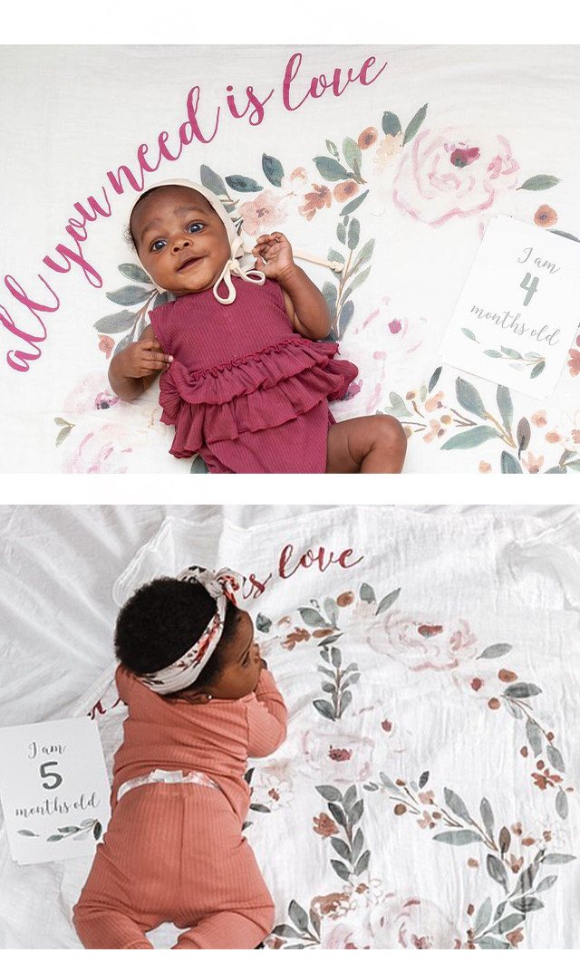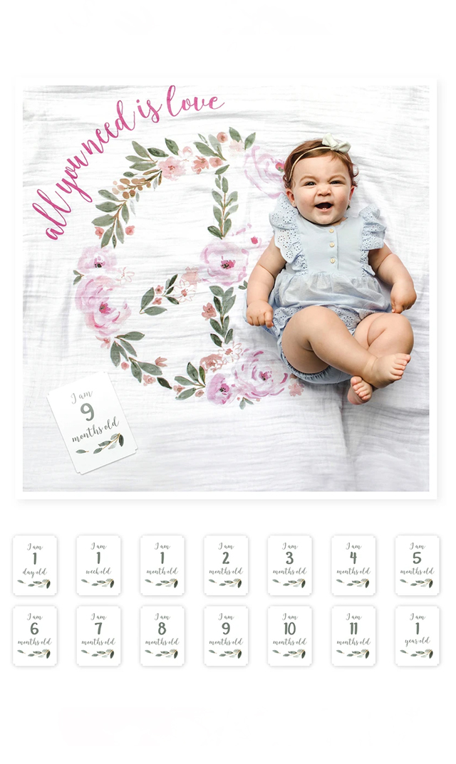おくるみに、14種類の月齢カードが付いているので、生まれたその日から、1歳の誕生日まで記念撮影をお楽しみいただけます。