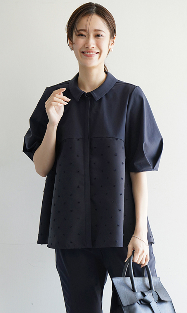 襟付きのきちんと感、ドットや裾のデザインの可愛さがほど良く、とても気に入っています。ネイビーなのにテンション上がるので、なにかと選んでしまいよく着ています。子供達にも褒められて、とても嬉しいです。