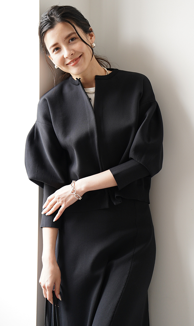 ネイビーに続きブラックも購入しました。他では見かけないデザインと、ローラシリーズの生地が気に入っています。ローラシリーズのスカートや手持ちのワンピースなどに合わせて着ようと思っています。サイズは158cm、やや細め体型、XSでちょうどいいです。