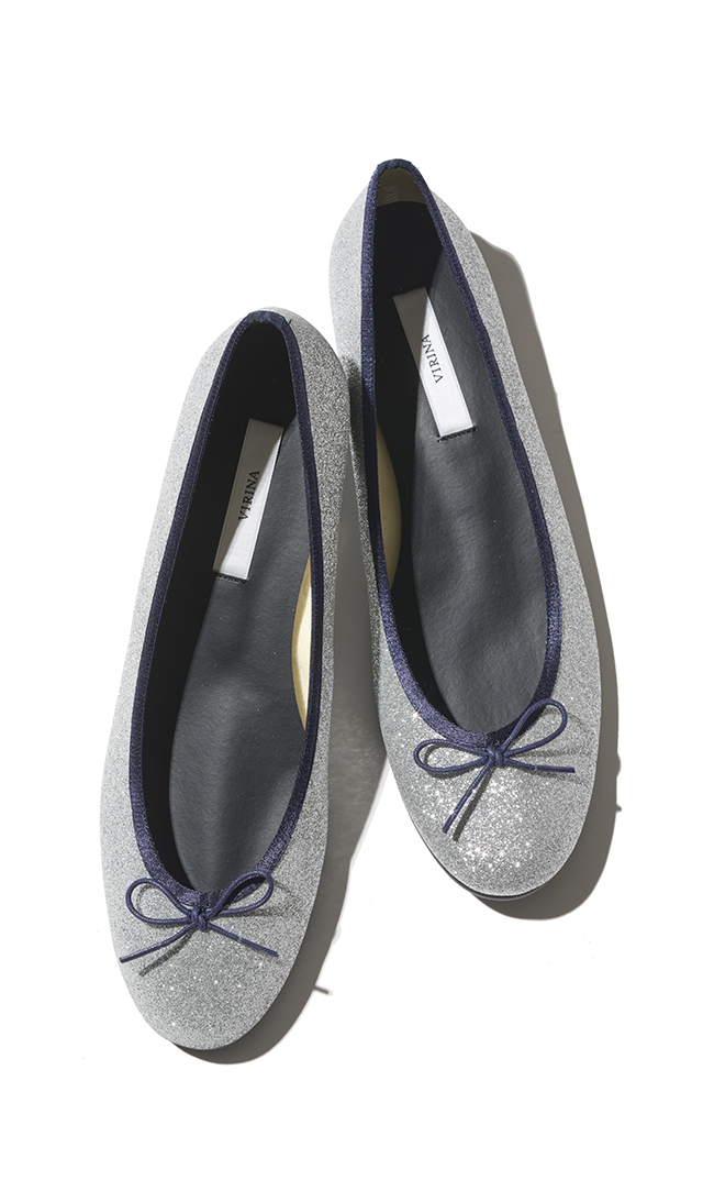 VIRINAさんのバレエシューズが大好きで、いろいろなデザイン・カラーで何度もリピート買いしています。どれもガシガシ歩いても足が痛くなりにくいですし、靴もヘタリにくいです。こちらのシューズは、ネイビーが効いているところが気に入っています。グリッターは画像よりキラキラ感が強い印象です。