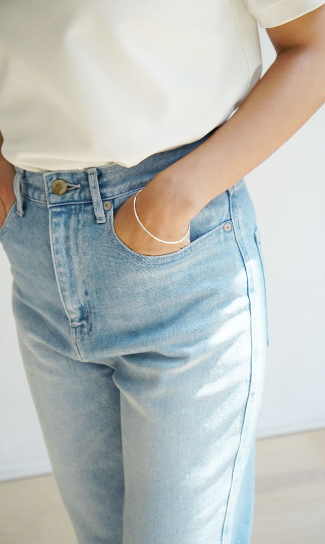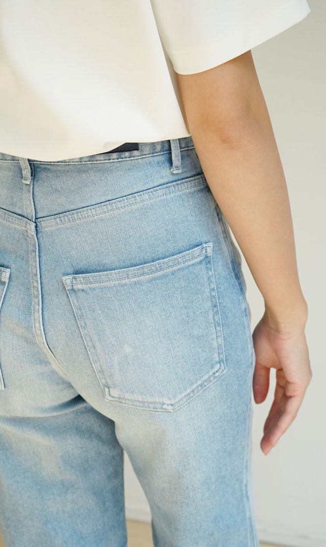 ・天然の花オイルに漬け込み加工することで、快適なはき心地や肌触りに加え、抗菌性も併せ持つ肌に優しいデニムに仕上げている。