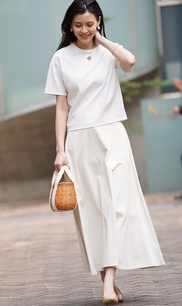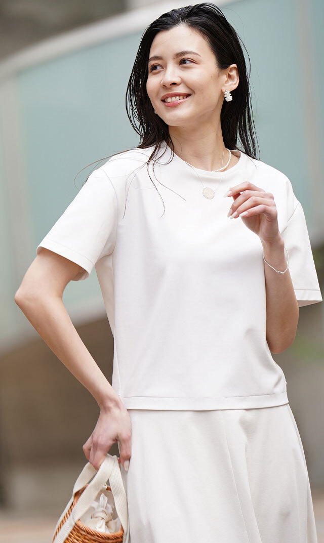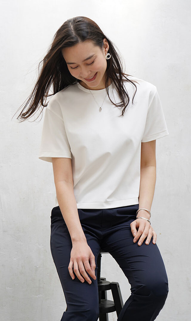 ・やや長めの袖丈に体のラインを拾わない絶妙なシルエット。