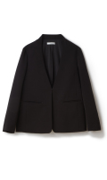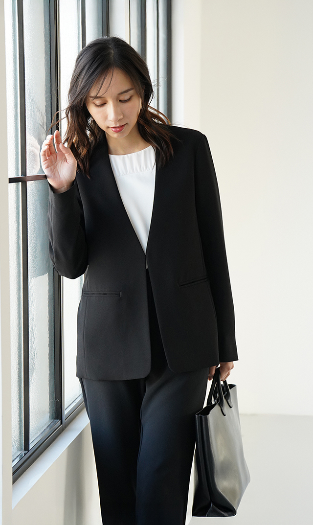 ・シャープな印象の洗練されたネックラインとディテールを削ぎ落したジャケット。