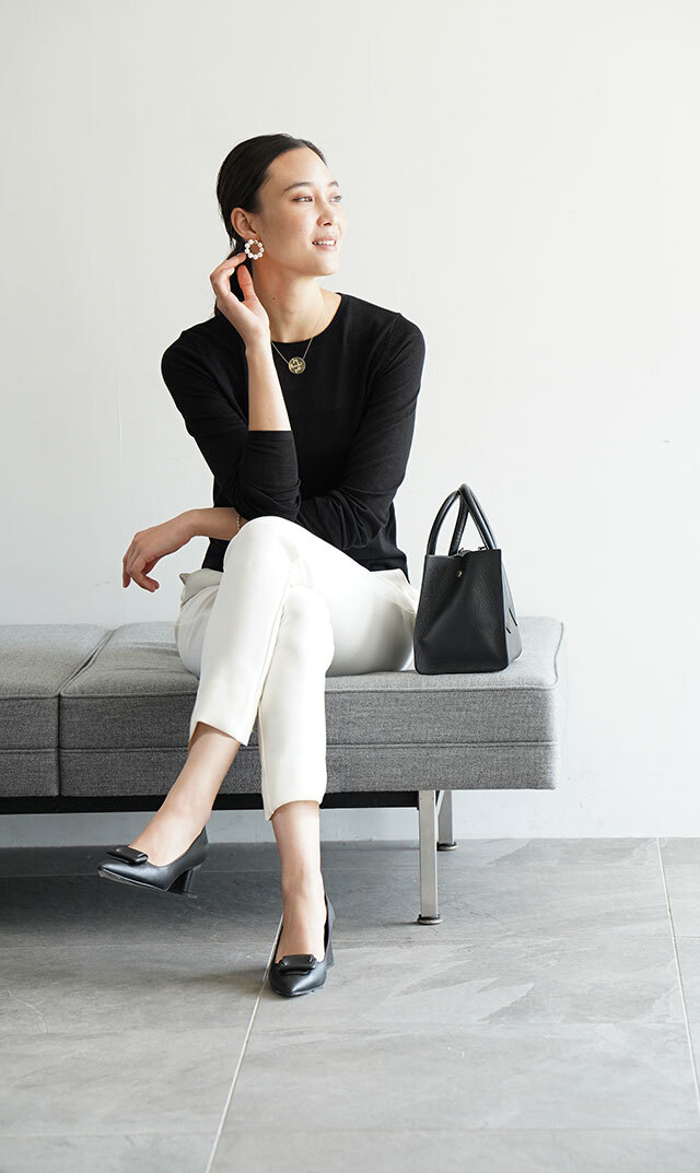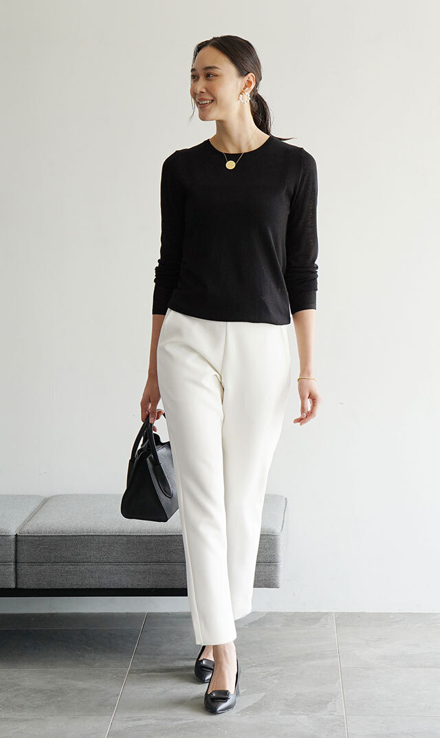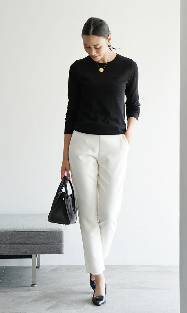 丸みの少ないスッキリと直線的なテーパードラインで、脚が美しく見えるようにこだわったデザイン。絶妙なゆとりを持たせながら仕上げた、きれいなシルエットが魅力です。ウエストはやや低めにマークし、マニッシュな雰囲気をプラス。ベルト幅は太めにして、ウエストがすっきり見えるようにデザインしました。すっきりシルエットはトップス選びも悩まず、即座に大人の着こなしにマッチ。シワになりにくく、縦にも横にも伸縮する360°ストレッチで快適な着心地な上に、どんなシーンにも浮かない上品な佇まいが秀逸。同素材のジャケットとのセットアップスーツもおススメです。