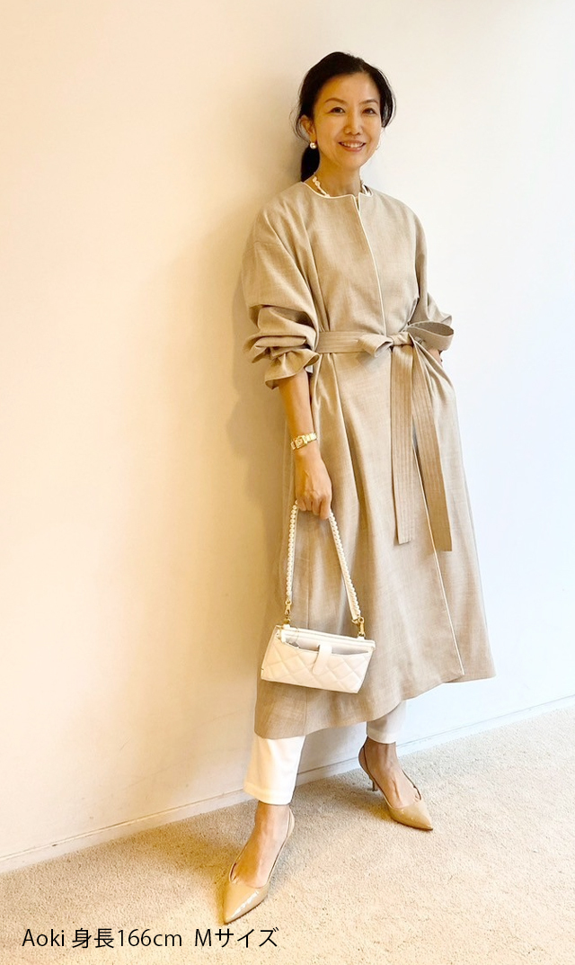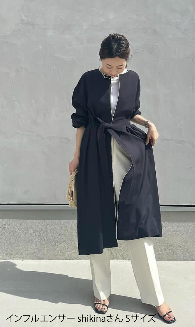 ゆとりのあるシルエットでサラッと羽織るだけでサマになる、こなれ感のある着こなしはもちろん、リボンベルトでウエストをキュッと結んだフィット&フレアのエレガントな着こなしも素敵です。