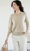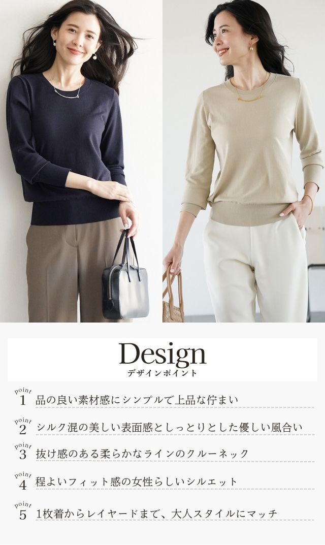 シルク混の美しい表面感としっとりとした優しい風合い、着まわし力の高さが魅力の“アデルクルーネックニット”