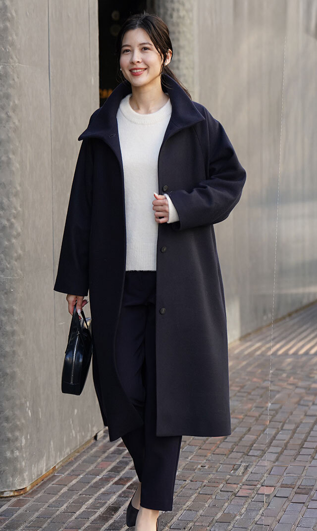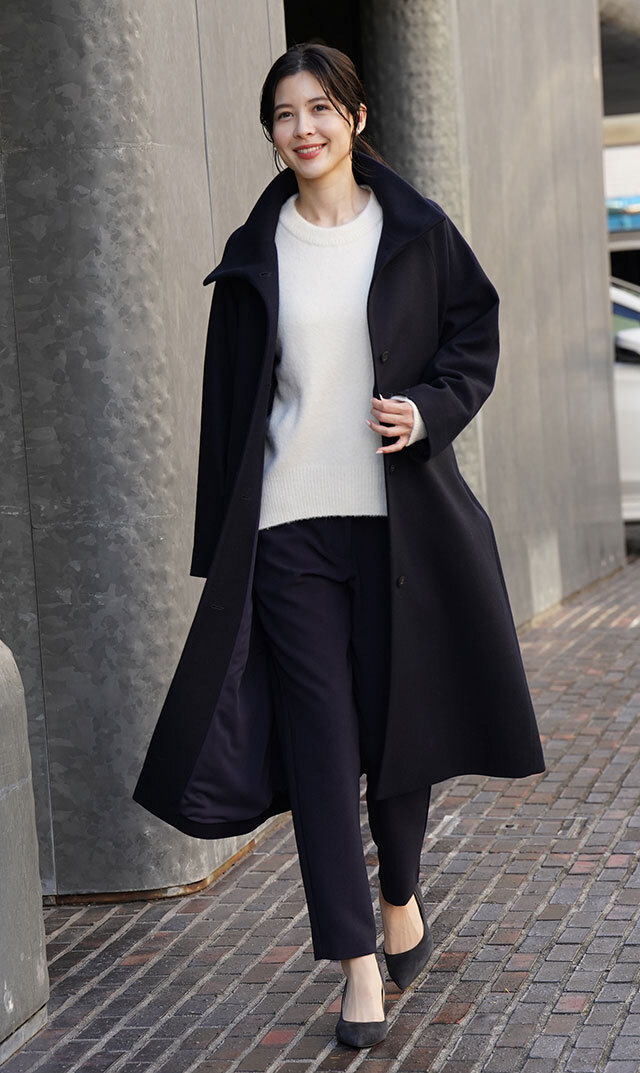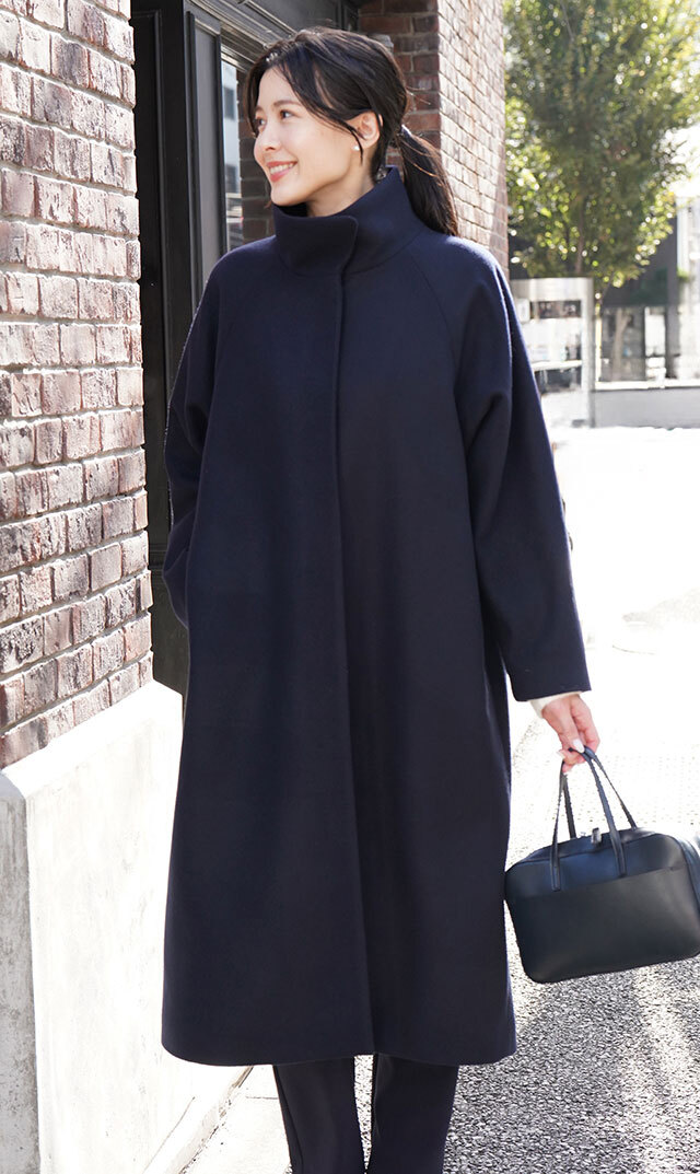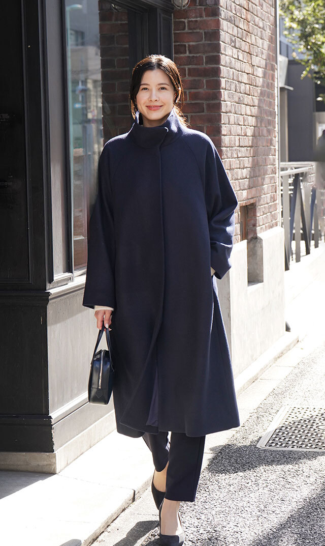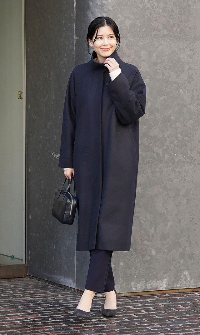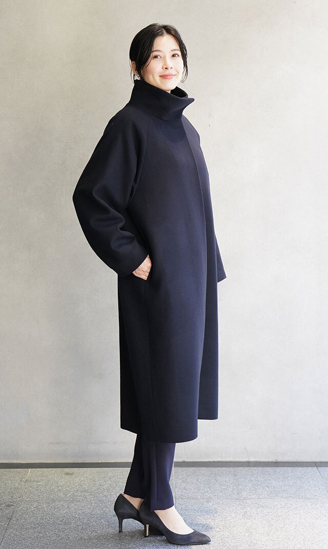 ・スタンドカラーが、顔まわりに存在感を与えつつ、小顔効果も。