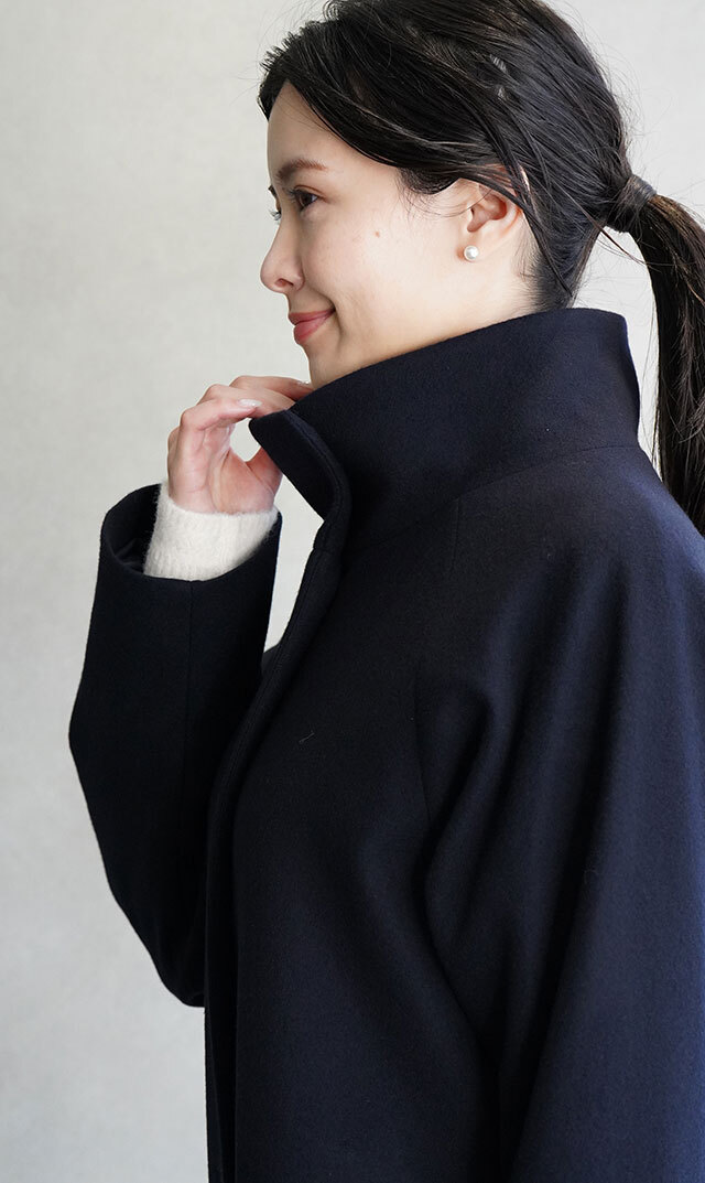 ・顎までかかるような高く広めのスタンドカラーがアクセント。