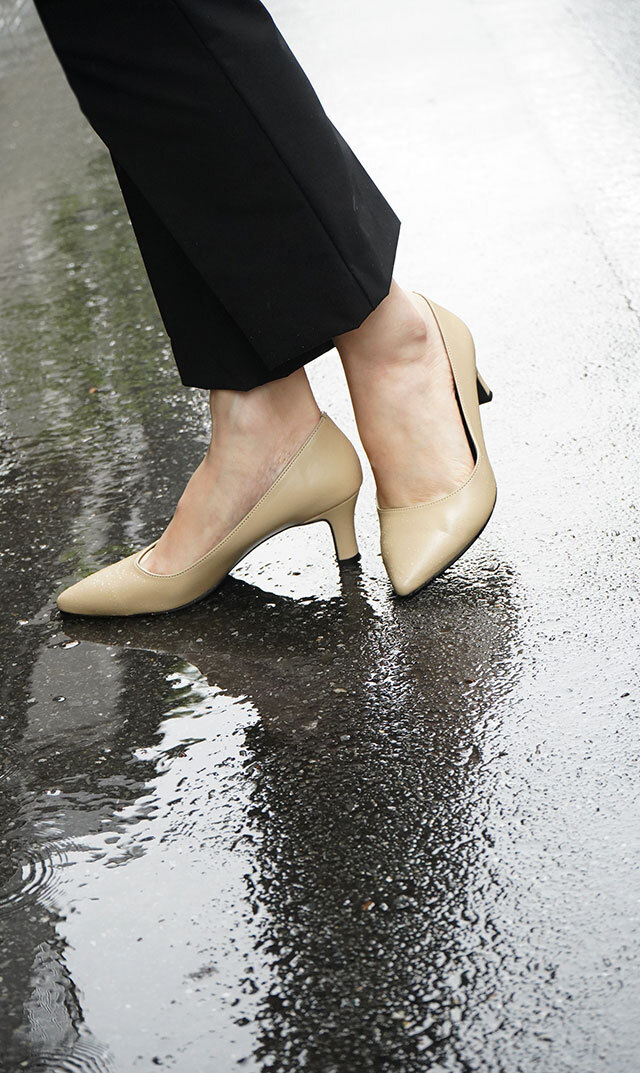 オフィスやオケージョンシーンなどキレイめスタイルははもちろん、カジュアルスタイルの格上げアイテムとしても◎。5cmヒールパンプスでも、オリジナルバレエシューズに極限まで近づけた心地良い履き心地。歩きやすさとコーディネート力を兼ね備えたパンプスは、まさに女性の強い味方です。耐水性素材だから急な雨にも安心。クローゼットにあると便利な1足です!