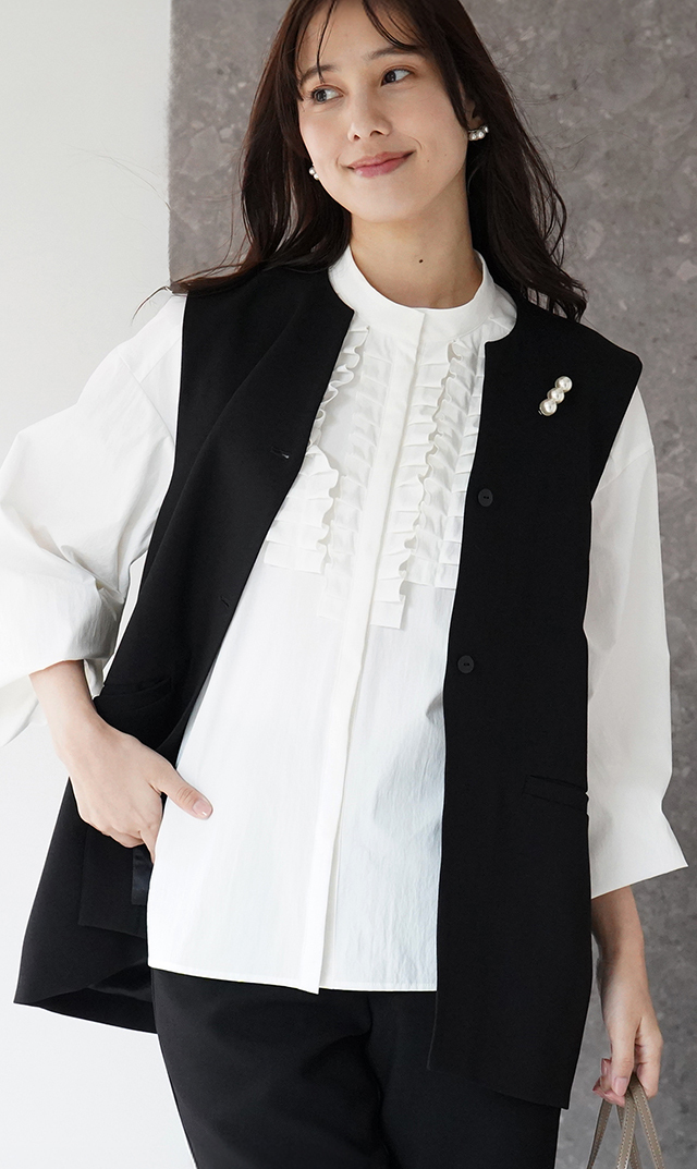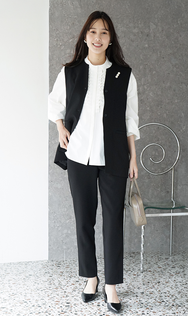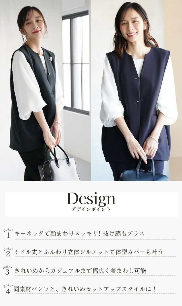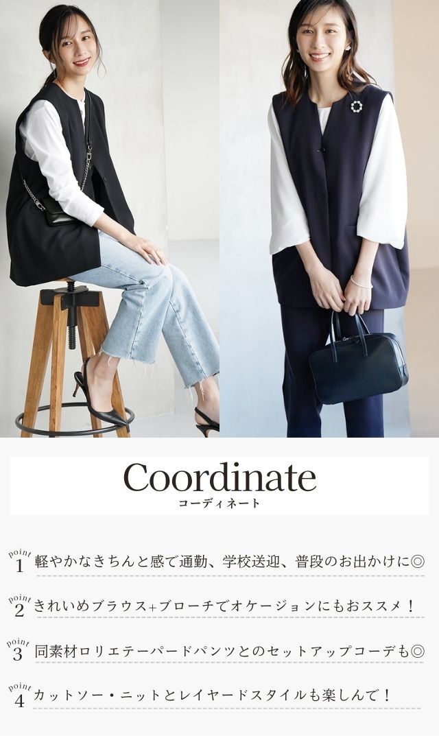 ・ボタンを留めてきちんとキレイ見えスタイル、ジャケットほど畏まりたくはない時のベストアイテム。