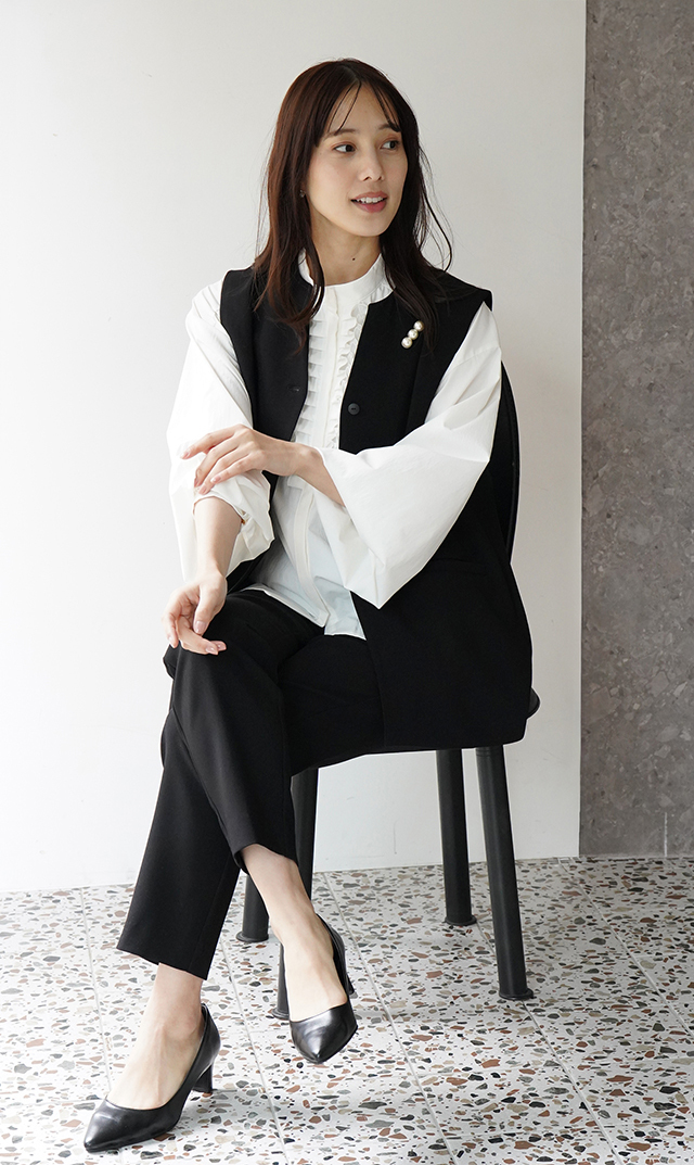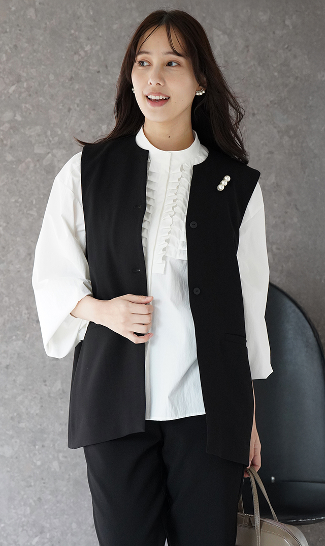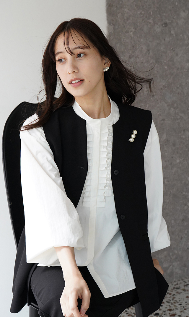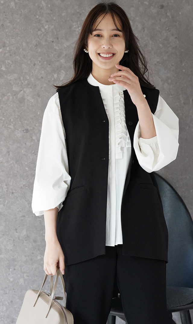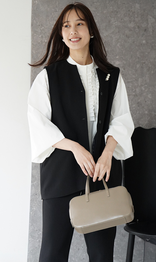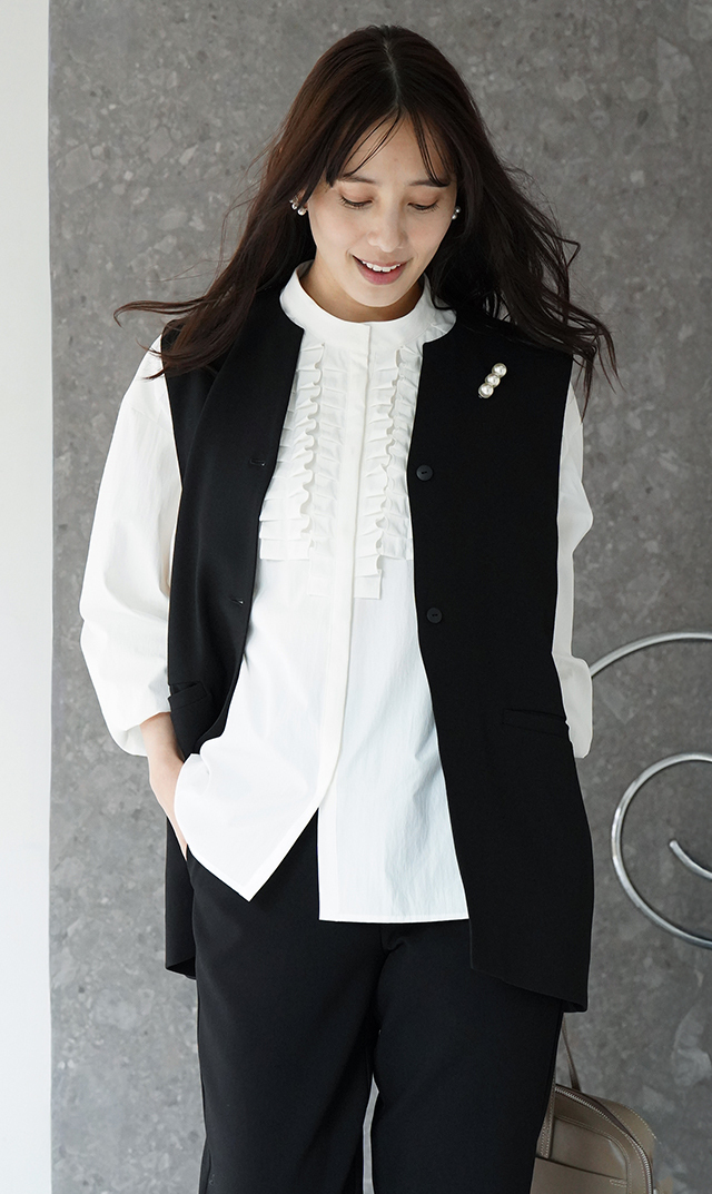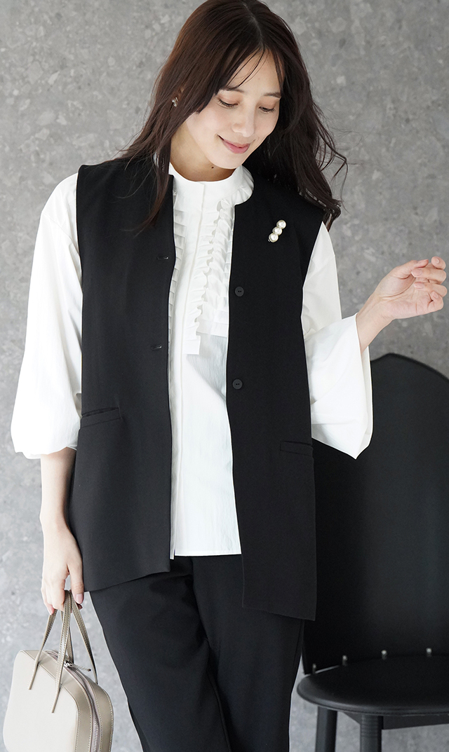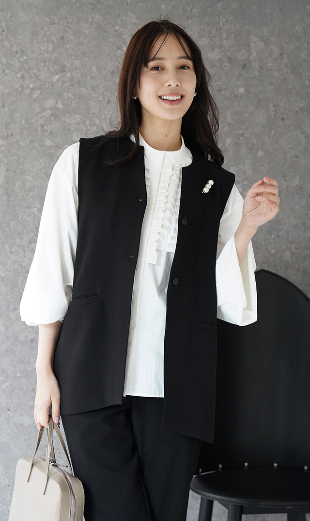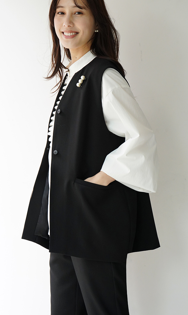 ・上品な素材使いで洗練されたルックに仕上げたジレ。