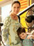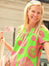 ビビッドなグリーンとピンクの'70sなミニドレスが素敵なママ。ドレスは「H&M」のもの。プチプラでこんなにインパクト大なドレスをチョイスしているところが買い物上手な証!シューズやバッグはキャメルでトーンを押さえているから、更にドレスが引き立っています。