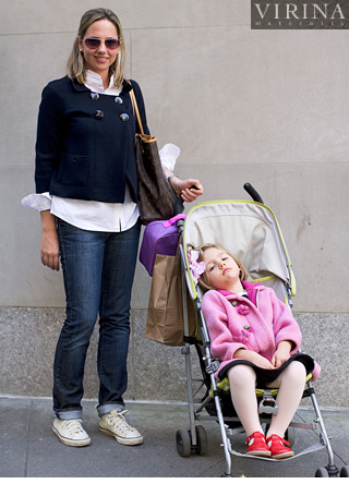 デニムにコンバースのスニーカーというカジュアルなアイテムを、「Jクルー」のシャツ&ジャケットでトラッドに着こなしていたサラ。何気ないようでいて、ジャケットの袖口や裾からのぞく白シャツのバランスが絶妙。ややご機嫌斜めな表情でベビーカーに座っている娘のフリースジャケットは「ギャップ」だそう。