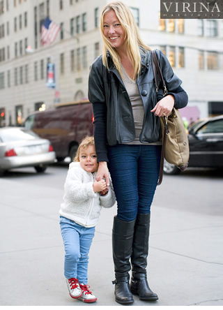 ママと手をつないで、お茶目なポーズで決めてくれたエヴァは2歳半。モコモコフリースのジャケットが暖かそう。ママも、ブーツとジャケットを黒いレザーでまとめたコーディネートがすっきり決まっていた。インナーとバッグでベージュをプラスしてたことで、ハードになりがちなレザーブルゾンを柔らかな印象に見せている点にも注目。
