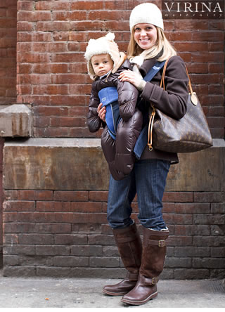9ヵ月半の息子を「ベビービョルン」のキャリーで抱いてお散歩していたのはジル。同色のコートとブーツ、「ルイ・ヴィトン」のバッグというブラウン基調のコーディネートにぴったりマッチしたベビーのカバーオール。帽子だけ明るい色を合わせたところもさりげなくお揃いになっている点にも注目。ベビーのアウターは、自分のお気に入りアウターと同色にするというアイディア、いただき!